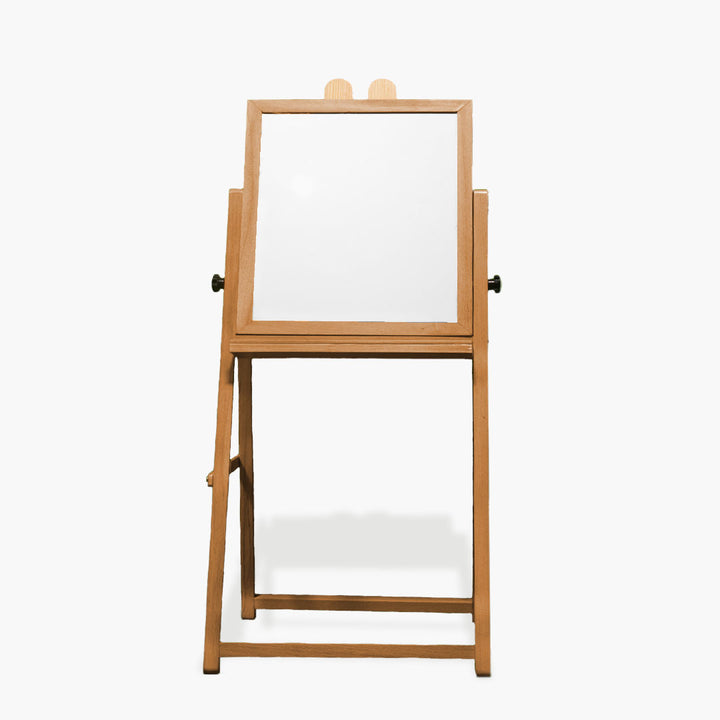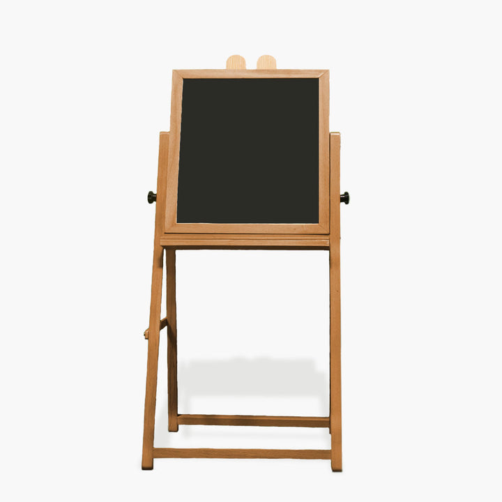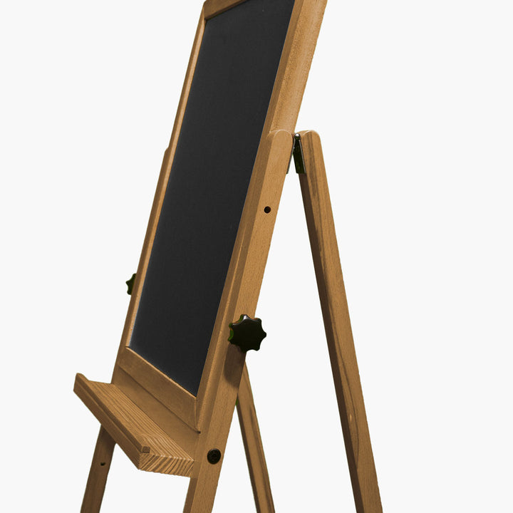 - Dual-sided easel with a magnetic whiteboard and a chalkboard.