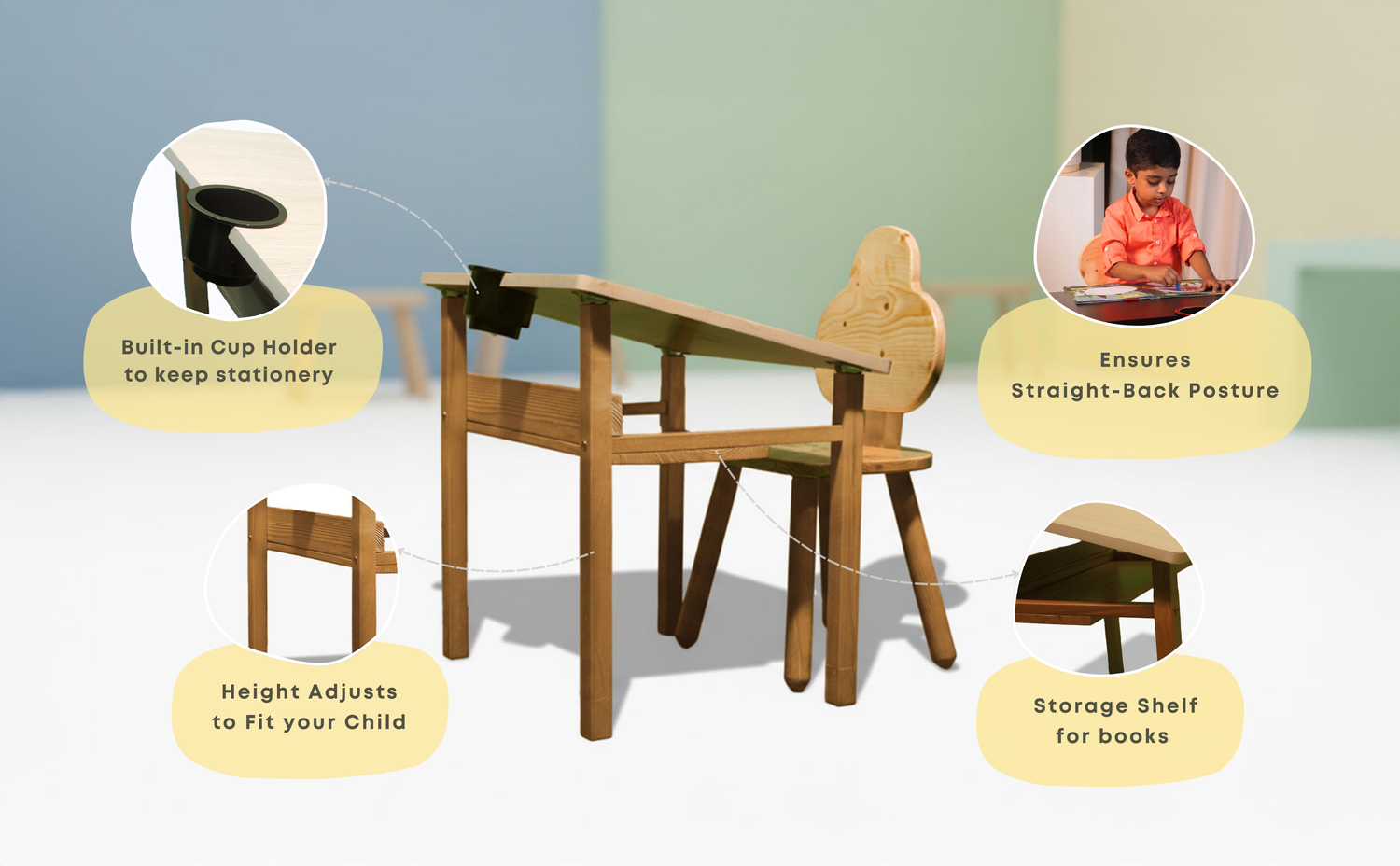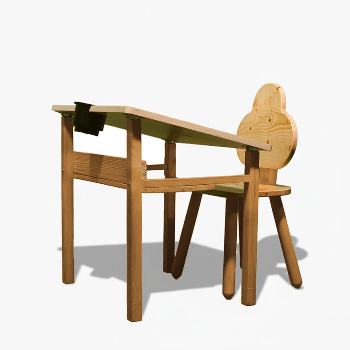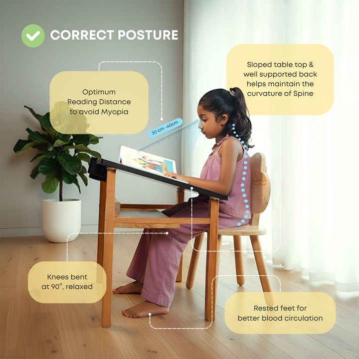 Designed for a ‘straight back’, the ergonomically sloped table top promotes good posture from an early age, supporting healthy spinal development.