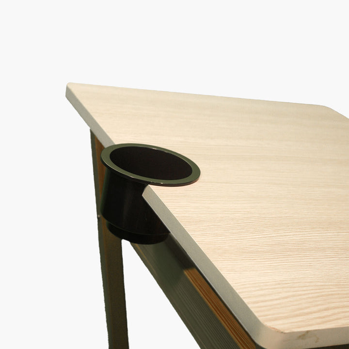 - Integrated cup holder keeps workspace tidy.