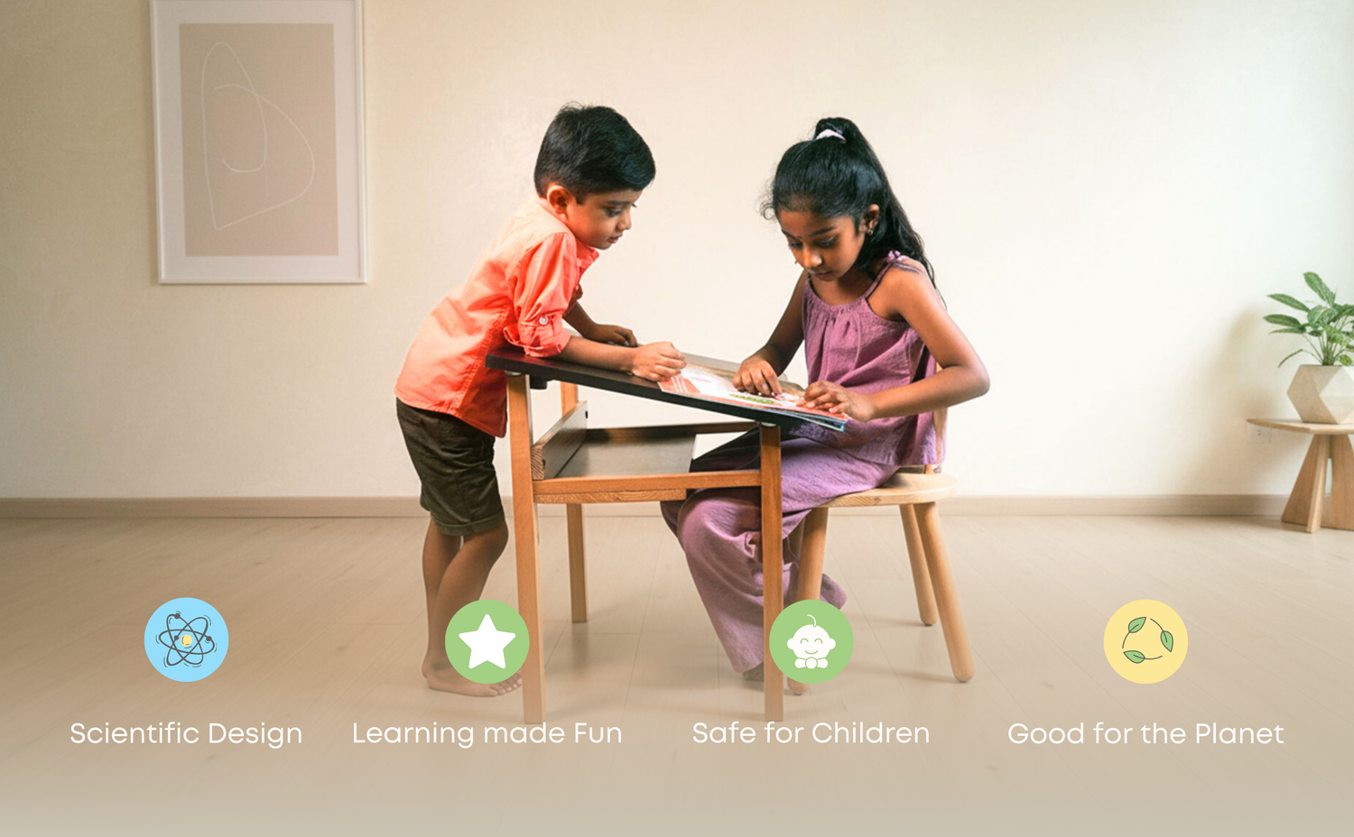 The table includes built-in storage space to keep books, crayons, and art supplies neatly arranged, teaching kids early organization habits.